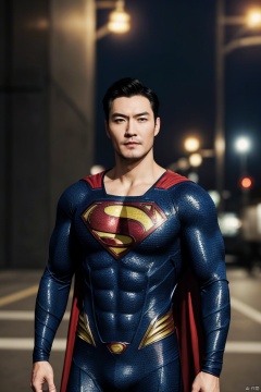 1man,superman,male focus,(masterpiece, realistic, best quality, highly detailed,profession),asian,exquisite facial features,handsome,deep eyes,large pectorales,superman suit,night lighting,neon, cinematic composition,blurry,jzns, hzbz