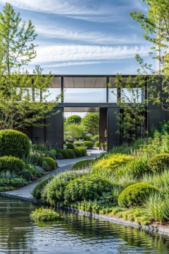 masterpiece,best quality,outdoor landscape,long-lasting flower border,view pavilions,residential district,<lora:(绿化)长效花境2:0.8>,cxhj,sky,daytime,
