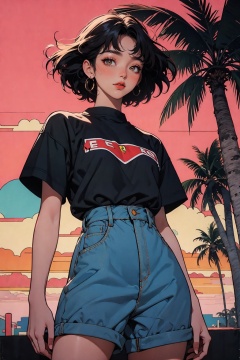 retro girl, Miami, sunset, Ferrari, palm tree, 90's, (flat colors, flat texture, lineart:1.2), graphical design, (heavy ink, ink blacks), <lora:AstrAnime_RETRO:1>