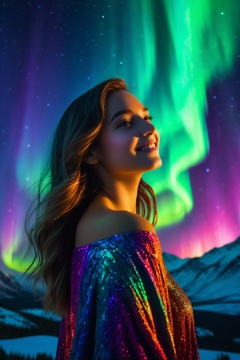 (best quality, 8K, highres, masterpiece), ultra-detailed, (super colorful, vibrant), enchanting image of a beautiful girl with a shoulder-length angled blunt-ends hairstyle. Her smile radiates warmth and positivity without any hint of arrogance. She stands gracefully under the mesmerizing glow of the aurora borealis in a vibrant night scene. The surrounding atmosphere is filled with a kaleidoscope of colors, creating a vibrant and ethereal dance of light. The girl embodies Nocturnal Grace, exuding Silent Luminescence amidst the Midnight Flutter of colors and the Whispering Silent beauty of the night. Every moment is an Iridescent Encounter with the Moonlit Shadow, celebrating a captivating and colorful display of artistry.