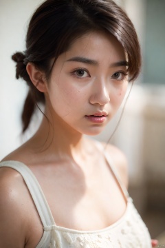 (((masterpiece))),  best quality,  realistic,  (best quality),  {{masterpiece}},  {highres},  original,  extremely detailed 8K wallpaper),  A young woman in a white dress,  with dark hair tied back,  posing against a dark background. The image has a shallow depth of field,  focusing on her face and upper body. The lighting is soft yet dramatic,  highlighting her facial features and the contours of her dress. The overall style of the photo can be described as contemporary portrait photography,  emphasizing emotion and mood over detail.,<lora:EMS-287781-EMS:0.800000>,<lora:EMS-267958-EMS:0.500000>