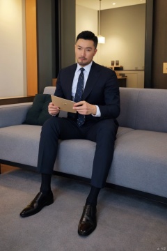 1man,male focus,(masterpiece, realistic, best quality, highly detailed,profession),asian,exquisite facial features,handsome,deep eyes,large pectorales,jacket,pants,colorful sheer formal socks,footwear,(full shot),sitting,indoors,golden hour lighting,winter,80s movie,from below,depth of field,cinematic_angle, jzns