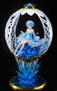 PVC,1girl,blue eyes,blue hair,solo,dress,barefoot,hair ornament,rem (re:zero),sitting,hair over one eye,short hair,looking at viewer,choker,bow,ankle cuffs,bare shoulders,hair flower,black background,full body,smile,blue dress,hair bow,faux figurine,detached sleeves,open mouth,flower,breasts,bangs,x hair ornament,alternate costume,