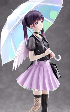 (masterpiece), (best quality), illustration, ultra detailed, hdr, Depth of field, (colorful), loli,PVC, 1girl, solo, skirt, umbrella, twintails, holding umbrella, transparent, holding, pink skirt, jewelry, wings, shirt, fishnets, black shirt, earrings, short sleeves, purple skirt, thighhighs, black hair, heart earrings, transparent umbrella, angel wings, heart, feathered wings, long hair, bangs, white wings, asymmetrical legwear, pink nails, bracelet, multicolored hair, standing, nail polish, choker, puffy sleeves, looking away, purple eyes, collar, grey background, heart o-ring, collarbone, puffy short sleeves, bag, heart choker, closed mouth, suspenders, looking to the side, black choker, feet out of frame, purple hair, pleated skirt, black thighhighs, backpack