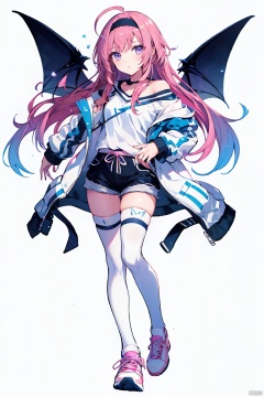 1girl, solo, long hair, looking at viewer, bangs, shirt, thighhighs, long sleeves, holding, bare shoulders, very long hair, standing, purple eyes, jacket, full body, white shirt, pink hair, ahoge, hairband, wings, shoes, shorts, black thighhighs, off shoulder, short shorts, watermark, black shorts, white footwear, white jacket, sneakers, Fangren