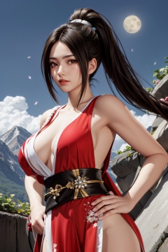 outdoor,(black hairs:1.2),(large breasts:1.2),flowers,floating hair,sky,rainbow,moon,sky,stars,( hand on hip:1.3),standing,mountains,1girl, shiranui mai, breasts, solo, hand fan, ponytail, folding fan, pelvic curtain, cleavage, brown hair, large breasts, revealing clothes, long hair, brown eyes, japanese clothes, rope, folded fan, high ponytail, sash, ninja, bare shoulders, holding, watermark, no bra, holding fan, obi, lips,official art,extremely detailed cg 8k wallpaper,looking at viewer,(extremely delicate and beautiful),solo,realistic, photo_\(medium\),<lora:dingdang-buzhihuowu:0.55>