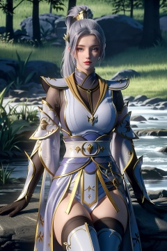 ((HRD, HUD, 8K)),((masterpiece, best quality)), highly detailed, (perfect anatomy:1.2),1girl, solo, ponytail, long hair, grey hair, hair ornament, blue eyes, makeup, red lips,armor, gloves, breasts, thighhighs, boots,pond, water, sitting on river, (cowboy shot), looking at viewer,<lora:斗破苍穹韩月_v1.0-shishu:0.8>