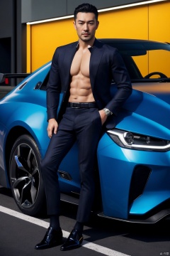 1man,fashion model,male focus,(masterpiece, realistic, best quality, highly detailed,profession),asian,exquisite facial features,handsome,deep eyes,pectorales, tight see-through shirt,belt,pants,sheer socks,footwear,rolled up, large pectorals, partially unbuttoned, pectoral cleavage, between pectorals,Business fashion,lean on a car, sports car,night lighting,neon,cyberpunk,full body,blurry,jzns,