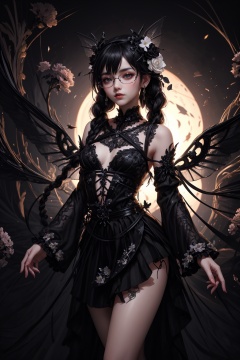 (Ink and wash:1.3),(Deconstructive style:1.6),[(nsfw)::1],[[delicate fingers and hands:0.55]::0.85],(:black:0.9):1.12222}},{(:purple:0.3):1.11111},{(white::0.5):1.13333},(girl Focus:1.4),(beautiful detailed eyes:1.1),(beautiful detailed girl:1.2),[:outline:0.9],(solo:1.2),(1girl with black_flowers_wings:1.6),(Galaxy),(colorful (planets:1.1)),Negative space,background detailed,(Starry sky adorns beautiful detailed dress),golden {leaf-shape} headdress around two sides of head,(full of size:1.1),full body,(standing:1.3),(sketch:1.05),(watercolor:1.02),(beautiful detailed black_flowers),(beautiful detailed water),(looking at viewer:1.4),(black_tone:1.2),(1Girl_(tulle_lace_dress),(skirt:1.3),(Organza_ace:0.3),(bow:1.3),(Serious:1.2),(she_with_(side braids:1.5),((black:1.8)_inner_hair:1.6),(hairband , flower hair_ornament:1.25),,(she_with_(Glowing_eyes:0.8)),(black eyes:1.2),(no eyes:1.2),(Black frame glasses:1.2),(she_have _(smallbreasts:1.2)),(she(黒いマスク:1.3),(Long sleeves_with_wide_sleeves, ribbon-trimmed_sleeves)),(she(Earrings:1.2),(Lace_up_socks:1.2)),,,moon,,(black_flowers:1.2),(black_flowers scattered:1.2),,(Sputtering:1.4)/= (Sputtering_black_flowers_wings:1.2),(black_flowers Sputtering:1.2),,<(+++(burn the Pinkish black blood))//)>,<(+++++(black Fire)//)>,,cinematic lighting, volume lighting, bloom effect, light particles.,,