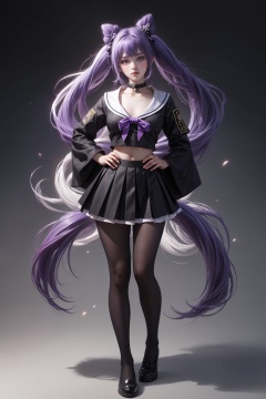1girl, keqing (genshin impact), solo, pantyhose, skirt, long hair, school uniform, cone hair bun, full body, looking at viewer, serafuku, white background, purple hair, simple background, twintails, hand on hip, breasts, black serafuku, hair bun, long sleeves, black skirt, pleated skirt, black footwear, standing, bow, shirt, shoes, sailor collar, armband, hair bow, bangs, black pantyhose, black shirt, neckerchief, purple eyes, large breasts, very long hair, collarbone, blush, choker, closed mouth, black sailor collar, white bow, alternate costume, loafers, black bow, hair ornament,