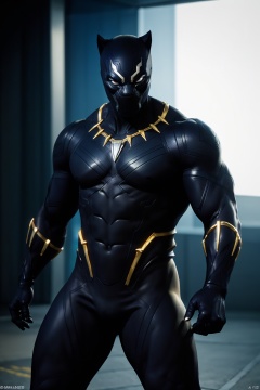 masterpiece,1 boy,Look at me,Marvel,Black Panther,Mask,Tights,Golden texture,Muscular development,The background of science fiction,Neon light,Warfare,Combat posture,textured skin,super detail,best quality,,