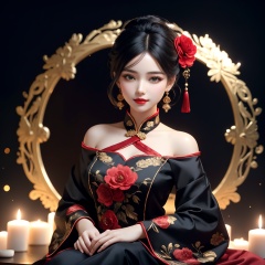 1girl,hair ornament,solo,flower,hair flower,candle,earrings,jewelry,black hair,black eyes,blurry,lips,red lips,looking at viewer,tassel,depth of field,makeup,realistic,(red_clothes:1.3),chinese clothes,floral print,upper body,medium breasts,off-the-shoulder,sitting,smile,High detailed,masterpiece BREAK fine gloss,full length shot,Oil painting texture,(Black Background:1.3),bow-shaped hair,3D,ray tracing,reflection light,anaglyph,motion blur,cinematic lighting,motion lines,Depth of field,ray tracing,sparkle,vignetting,UHD,8K,best quality,textured skin,1080P,ccurate,upper body,