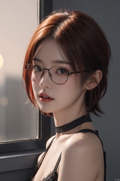 ((red hair:1.5 )), Classic Hollywood glamour, (Straight bangs hair), Short hair, curly hair, ((Wear glasses:1.8)), (Huge boobs:1.2), (Wear a black lace bra), (flawless skin), luxurious backdrop, portrait of 1girl by Bill Henson, depressed, tears, streaming tears, ruins, shadows, dramatic lighting, sunset, contemporary, dark, expressionism, dystopia, industrial, zhangyuxi, bj_Devil_angel, bedroom, evening, (Blunt bangs), jujingyi, zhangyuxi, wanglin, bj_Devil_angel, linzhiling, (1 red collar), (next to the window), yunqing,<lora:EMS-238827-EMS:0.500000>