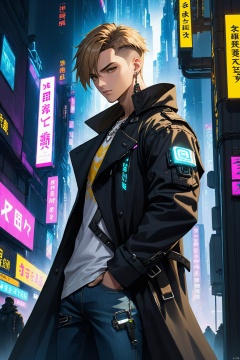 (best quality),  ((masterpiece)),  (highres),  illustration,  original,  extremely detailed, male focus,  1boy\(cyberpunk,  18 years old\),  muscular male,  whirte t-shirt with text "ZOTAC", black trench coat,  jeans,  boots, warming, short silver and light brown hair, necklacer, BREAK,  look at viewer,  from side,  building,  cityscape, ,  cyberpunk,  dramatic,  key visual,  vibrant,  highly detailed