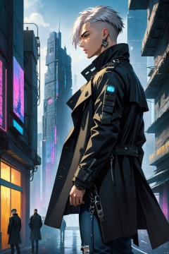 (best quality),  ((masterpiece)),  (highres),  illustration,  original,  extremely detailed, male focus,  1boy\(cyberpunk,  18 years old\),  muscular male,  whirte t-shirt, black trench coat,  jeans,  boots, warming, short silver hair, necklacer, building,  cityscape,  clothing cutout,  (cropped jacket),  cyberpunk,  from side,  dramatic,  key visual,  vibrant,  highly detailed