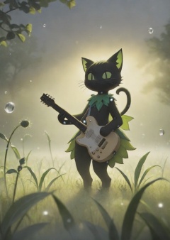 realistic detailed image, ((full body, the black cat plays the guitar)), lilligant, [sunny iridescence on dew drops], epic, cinematic photography with a clear focus, 16k hdr, volumetric lighting, depth of field, hyperrealism of fog and haze, bright colors and textures, unique patterns of nature as an artist, very stunning landscapes
