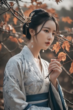 Fashion editorial style a asian girl with hanfu ruqun,Jin style, joint brand, ribbon, Withered leaves, old vines, plant illustration, splash ink,High fashion, trendy, stylish, editorial, magazine style, professional, highly detailed, cinematic lighting, Dramatic lighting
