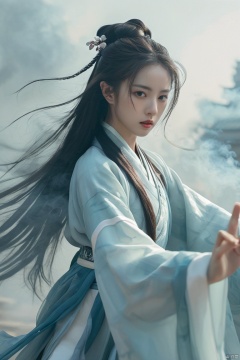 ,wuxia girl,hanfu dress hem resembling smoke,fractal art,long hair,cyclone,arm up,battle stance,close-up,looking at viewer