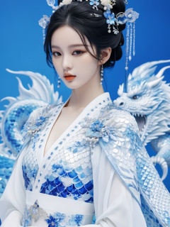 Transparent blue and white porcelain PVC skin, transparent blue and white porcelain colored skin scales, prisms, holography, color difference, fashion illustrations, masterpieces, Chinese dragon and Harajuku fashion, looking at the audience, 8k, super detailed, pixiv