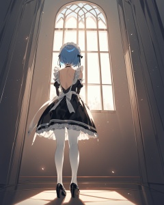 fajyobore,  1girl,  blue hair,  solo,  short hair,  roswaal mansion maid uniform,  maid,  rem (re:zero),  detached sleeves,  from behind,  indoors,  holding,  back,  frills,  window,  frilled sleeves,  dress,  white pantyhose,  pantyhose,  facing away,  ribbon,  black footwear,  long sleeves,  maid headdress,  shoes,  shoe soles,  breasts,  hair ribbon,  standing,  backless outfit,  hair ornament,  apron