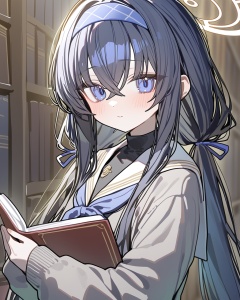 ningen mame,  1girl,  ui (blue archive),  solo,  book,  long hair,  black hair,  holding book,  holding,  hairband,  bangs,  bags under eyes,  blue hairband,  sailor collar,  blush,  long sleeves,  looking at viewer,  cardigan,  closed mouth,  white sailor collar,  hair between eyes,  school uniform,  halo,  upper body,  serafuku,  grey cardigan,  very long hair,  open book,  blue eyes,  purple eyes,  shirt,  crossed bangs,  ribbon,  black undershirt,  twintails,  bookshelf,  brown cardigan,  white serafuku