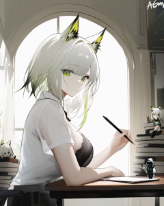 omone hokoma agm,  kal'tsit (arknights),  1girl,  breasts,  animal ears,  alternate costume,  green eyes,  shirt,  indoors,  breast rest,  white hair,  large breasts,  looking at viewer,  white shirt,  solo,  short sleeves,  pen,  short hair,  book stack,  holding,  cat ears,  bra,  breasts on table,  book,  animal ear fluff,  desk,  upper body,  closed mouth,  collared shirt,  window,  underwear,  bangs,  holding pen,  see-through,  character doll,  from side,  bra visible through clothes,  sunlight,  doctor (arknights),  phone,  day