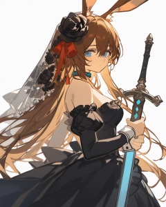 ciloranko,  god light, 1girl,  animal ears,  solo,  dress,  black dress,  blue eyes,  amiya (arknights),  rabbit ears,  long hair,  white background,  sword,  holding,  hair ornament,  weapon,  flower,  simple background,  looking at viewer,  brown hair,  breasts,  holding sword,  hair flower,  holding weapon,  black flower,  red ribbon,  veil,  bare shoulders,  choker,  ribbon,  medium breasts,  bangs,  alternate costume,  hair between eyes,  from side,  rose,  upper body,  strapless,  very long hair,  hair ribbon,  black rose,  closed mouth,  wrist cuffs,  strapless dress,  looking to the side,  sidelocks,  animal ear fluff,  rabbit girl,  detached sleeves,  black choker,  frills