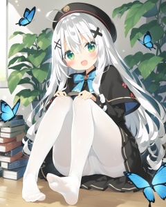 kani biimu,  1girl,  solo,  green eyes,  long hair,  bug,  book,  hair ornament,  hat,  white pantyhose,  butterfly,  no shoes,  looking at viewer,  pantyhose,  feet,  blush,  long sleeves,  bangs,  sitting,  black headwear,  white hair,  skirt,  ahoge,  x hair ornament,  hair between eyes,  open mouth,  smile,  blue butterfly,  capelet,  sweater,  sleeves past wrists,  hairclip,  beret,  book stack,  :d,  very long hair,  black capelet,  black skirt,  knees up,  legs,  toes,  can,  hand on own knee,  frills,  between legs,  soles,  bow,  indoors,  hand between legs,  plant,  puffy long sleeves