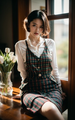 Ultra-realistic 8k CG, masterpiece, best quality, (photorealistic:1.4), HDR, absurdres, Professional, RAW photo, lens flare, (film grain:1.1), Bokeh, ((Depth of field)), studio light, a woman sitting in front of a window with flowers and a vase of flowers in front of her, 1girl, bouquet, checkered_skirt, dress, finger_to_mouth, flower, kazami_yuuka, lips, looking_at_viewer, plaid, plaid_bikini, plaid_dress, plaid_necktie, plaid_pants, plaid_ribbon, plaid_shirt, plaid_skirt, plaid_vest, plant, realistic, short_hair, solo, window. Highly detailed,Professional,extreme detail description;,