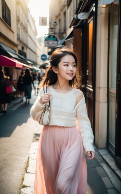 pink sunset,sunrays,(nature, buildings history modern art, amazing unreal background),(natural colors, correct white balance, color correction, dehaze,clarity),RAW photo,full sharp,wallpapper 8k uhd,dslr,soft lighting,high quality,Fujifilm XT3,close-up shooting,fixed focus lens,hand-woven,complicated details,exquisite crafts clothing,(18-years old female child:1.2),a beautiful girl walking in the old streets of paris,coffee long dress,smile,Beautiful, thin face, smooth white skin,1