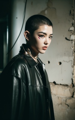 Best quality, masterpiece, ultra high res, (photorealistic:1.4), (B&W:0.6), raw photo, rim lighting, two tone light, professional, photoportait,,1girl, (buzz cut:1.1), (tattoo:1.1), injured, gucci, versace, cool, necklace, point-of-view,,damaged walls, concrete wall, street, Rubbish,Neon lights, noisy crowds,Dilapidated buildings,Overgrown with grass