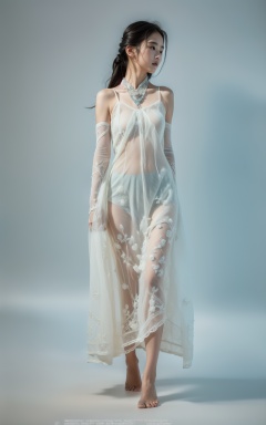(masterpiece, top quality, best quality, official art, beautiful and aesthetic:1.2),(photoreal:1.5),upper body,photo,intricate designs,textile art,handmade details,creative expression,A girl in a long white dress walks barefoot on an Antarctic glacier