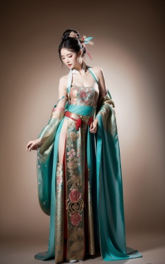 opera stage,(girl in hanfu:1.2),Vass Roland cover art body art future bass girl un wrapped smooth body fabric folds statue bust curls of hair petite lush front view body photography model full body curvebody art vibrant opera background Jonathan of metal skin material