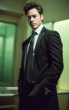 Robert Downey Jr.,wearing a suit to attend the meeting,(masterpiece, top quality, best quality, official art, beautiful and aesthetic:1.2),cover art,(photo effect:1.5),