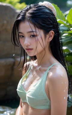 a girl bathes in the open air in the sun,the shower water poured on the girl's head,(all the hair is wet:1.2),(the hair on the top of the head is wet:1.2),open-air rain area,rock wall,shower overhead,In a sexy bikini,