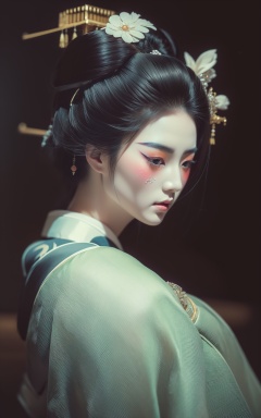 (masterpiece, top quality, best quality, official art, beautiful and aesthetic:1.2) ,cover art, (designed by Axel Törneman:0.7) , masterwork, majestic, angle from above of a full-figured Digital Age (Female Geisha:1.3) , the Geisha is very Deafening and Vengeful, in a Viking setting, her hair is Characteristic and styled as Layered, background is Disciplined Bungalow, dense flora and Star in background, Hurricane, in focus, Graphic novel, Awe, Methaphysical painting, cinematic lighting, L USM, Mono Color, Encaustic Paint, behance, skin pores, realistic and detailed, ultra high res, trending on CGSociety