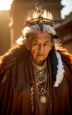 (nature, buildings history modern art, amazing unreal background),RAW photo,full sharp,wallpapper 8k uhd,dslr,soft lighting,high quality,Fujifilm XT3,upper body close-up,a gorgeous headpiece decorated with feathers,(an elderly male indian chief with a tall feathered ornate crown:1.2),outdoor,on the american savannah,mysterious historical sites,movie screen,ambience light,an old face,wearing traditional indian fur costumes,(old man:1.4),strong light and dark contrast,dark picture,(tall exaggerated crown:1.3),background blurring,
