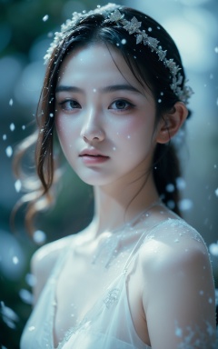 (masterpiece, top quality, best quality, official art, beautiful and aesthetic:1.2),(art by Anna Dittman:1.3),1girl,ballerina,(teenager:1.3),fair_skin,slender,diamond face,brown hair,light_blush,small nose,pointed nose,collarbonea,small_breasts,smile,reality,realistic,rubble_ruins,full_shot,in the forest,asians,darkness,the dark forest has only a little light shining through the leaves to the ground,(it's snowing:1.4),(very strong contrast:1.3),wearing handmade lace wedding dress,cool tone,film grain,