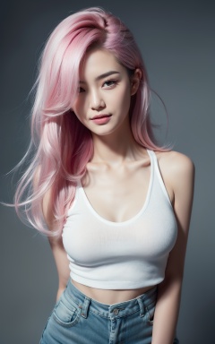 Peiyao Jiang,1girl,solo,(pink hair),gloves,long hair,shorts,blue eyes,fingerless gloves,hair over one eye,(red gloves),cleavage,smile,denim,**** top,looking at viewer,denim shorts,short shorts,blue shorts,shirt,leaning forward,collarbone,sexy,cute,Beautiful Finger,Beautiful long legs,Beautiful body,Beautiful Nose,Beautiful character design,perfect eyes,perfect face,Charming and wanton eyes,bodybuilding,pink eyebrows,(white ****_top),****_top,looking at viewer,official art,extremely detailed CG unity 8k wallpaper,perfect lighting,Colorful,Bright_Front_face_Lighting,(masterpiece:1),(best_quality:1),ultra high res,4K,ultra-detailed,,