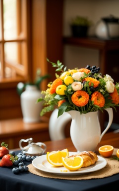 a table with a croissant,fruit,and a coffee pot on it with a vase of flowers,food,fruit,no humans,food focus,still life,blurry,strawberry,flower,cup,table,plate,realistic,lemon,orange (fruit),indoors,blueberry,blurry background,bread,plant,,
