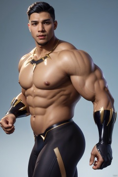 masterpiece, 1 boy, Black Panther, Black tights, Glossy, Muscular development, Strong and healthy, Uplift, A sexy man, Gradient background, Combat posture, High body fat, Big belly, textured skin, super detail, best quality,