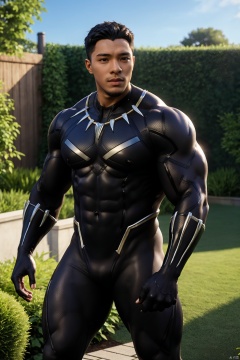 masterpiece,1 boy,Black Panther,Black tights,Glossy,Muscular development,Strong and healthy,Uplift,A sexy man,Garden,Combat posture,High body fat,Big belly,Obesity,textured skin,super detail,best quality,,