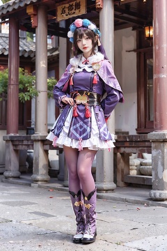 Yunjin,hair ornament,bonnet,purple dress,Pom-poms,knotting,black belt,red tassel,fur collar,pink capelet,purple hair,1girl,solo,long hair,full body,pantyhose,boots,purple pantyhose,bangs,dress,looking at viewer,standing,long sleeves,<lora:Yunjin:0.7>,<lora:add_detail:0.4>,