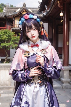 Yunjin, hair ornament, bonnet, purple dress, Pom-poms, knotting, black belt, red tassel, fur collar, pink capelet, purple hair, 1girl, solo, bangs, blunt bangs, closed eyes, black corset, long sleeves, capelet, long hair, blurry, corset, dress, facing viewer, architecture, multicolored headwear, east asian architecture, blurry background, fur trim, makeup,<lora:Yunjin:0.7>,