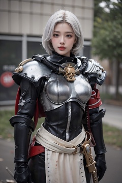 masterpiece,best quality,(photorealistic:1.4),(ultra detailed:1.3),masterpiece,unity 8k wallpaper,pelvic curtain,1girl,Sisters of battle,power armor,solo,skull,shoulder armor,pauldrons,white hair,short hair,boobplate,<lora:Sisters_of_battle-000009:0.7:lbw=TEXT1>,upper body,outdoors,