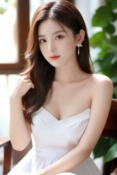 1girl, solo, long hair, looking at viewer, brown hair, black hair, dress, bare shoulders, brown eyes, jewelry, sitting, closed mouth, earrings, indoors, white dress, blurry, bracelet, book, window, leaf, chair, plant, hand on own face, head rest, realistic, anklet, , , g007, g009,,,,,,,,,<lora:660447824183329044:1.0>