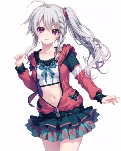 niimisora,white hair,purple eyes,ahoge,side ponytail,side braid,sora jacket,sora skirt,navel,, masterpiece,best quality,