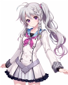 niimisora school uniform,white hair,purple eyes,ahoge,side ponytail,side braid,cowboy shot,, masterpiece,best quality,