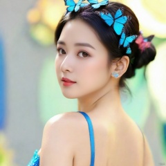 1girl, kochou shinobu, solo, butterfly hair ornament, hair ornament, black hair, breasts, full body, simple background, short hair, bug, sandals, dress, butterfly, grey background, spaghetti strap, blue background, bare shoulders, alternate costume, multicolored hair, updo, animal print, camisole, sleeveless, jewelry, small breasts