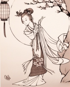 1girl, solo, horns, hand fan, japanese clothes, brown hair, long hair, looking at viewer, pointy ears, flower, hair ornament, holding, hair flower, kimono, twintails, gloves, parted lips, pink flower, bare shoulders, hair bun, cherry blossoms, off shoulder, , B&W,line art,, monochrome, greyscale, fine art parody